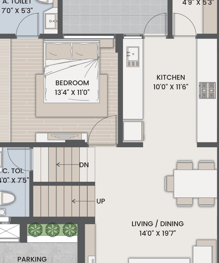 Vitrified flooring in living, dining, kitchen, all bedrooms granite staircase.